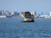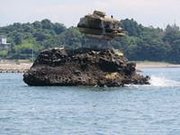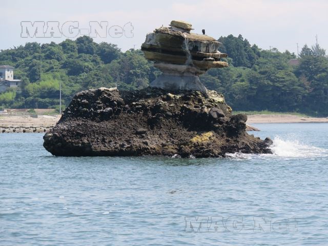 「仁王島」は、岩だらけの島の上に今にも落ちてしまいそうな小さな岩が乗っかっています。