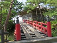 小島に建てられた仏堂「五大堂」へは、朱色の「すかし橋」を渡っていくことができます。