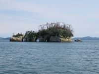島の下部が浸食され穴が開いた「鐘島」、4つの洞門に打ち寄せる波が鐘の音のように聞こえたことがこの島の名前の由来です。