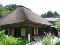本堂の「大悲亭」は、池を湛えた庭園を見渡すことができるわらぶきの建物です。