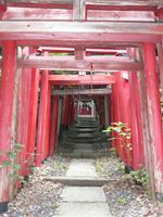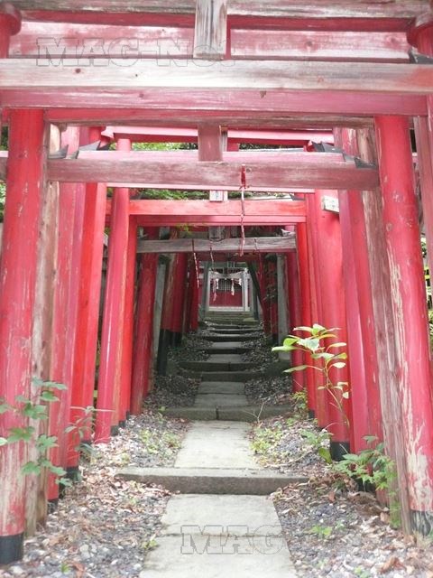 「伏見稲荷」を思わせるような幾重にも建てられた赤鳥居を潜り登っていくと、両側を狐の像に守られた神社本殿があります。