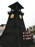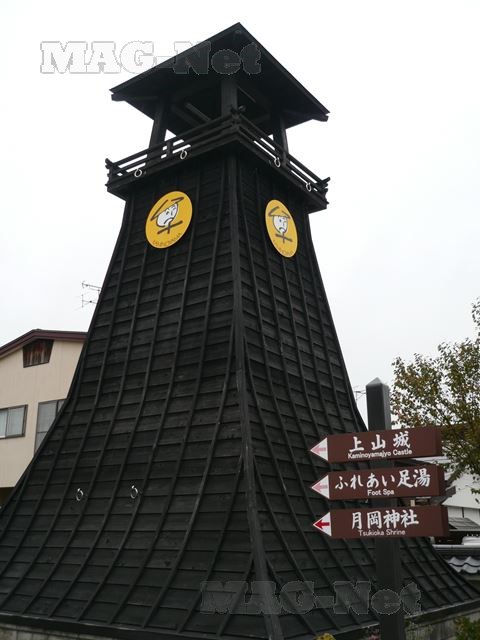 上山城から三島神社の前を下り、目印の櫓のあるところが、かみのやま温泉のメインストリートです。