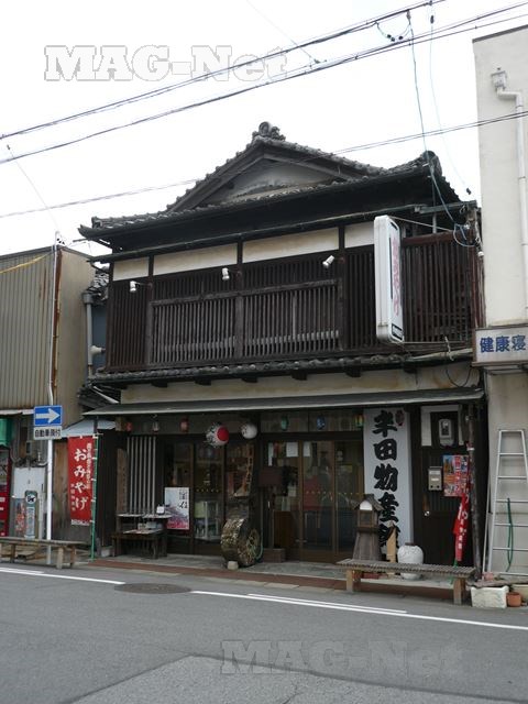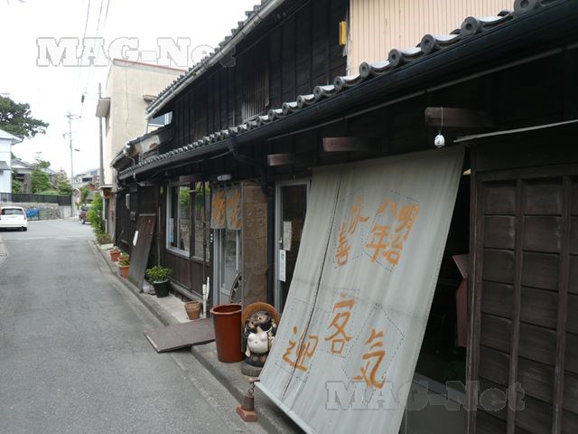 駅前の道を歩いていくと、味のある木造の建物が並びます。