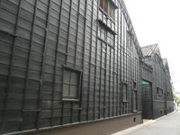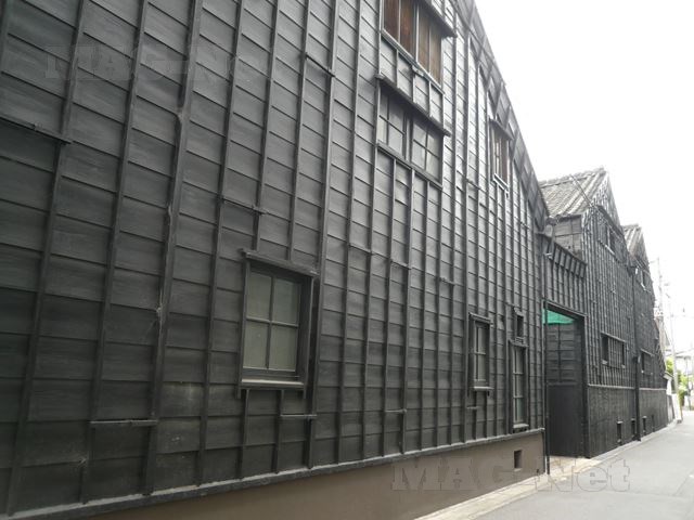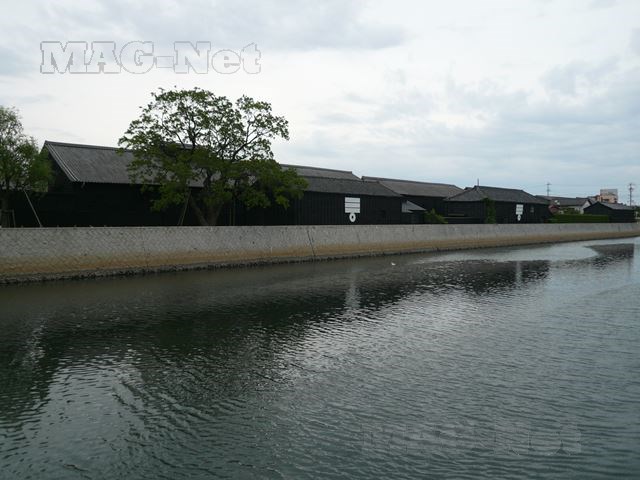 そして川の両側には、黒壁に横棒3本の下に○が描かれたミツカン酢の建物が並びます。