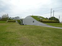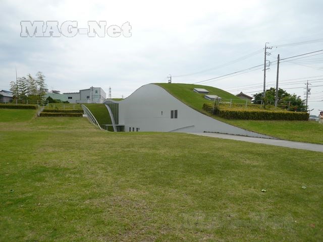周りを緑の芝生で囲まれ、そこに埋まるように記念館が建っています。