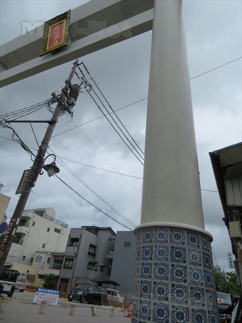 「深川神社」の石鳥居には、その足元に陶器が貼られています。