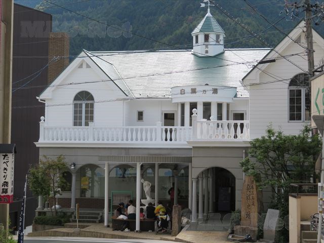 真っ白な洋風建築の建物の外には無料で入れるビーナスの足湯があり、観光客で賑わっています。