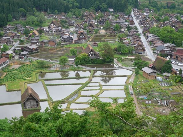 田の水面が陽の光に輝き眩しい光景の中に、藁葺屋根の家々がポツリポツリと見えます。
