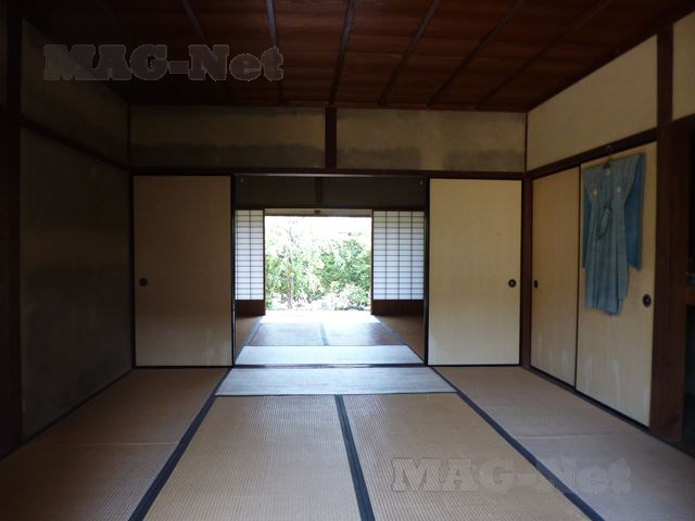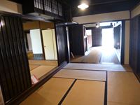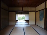 「笑門」のしめ縄が飾られた戸口をくぐると、土間に続いて和室が並び、当時のままの姿で残っています。