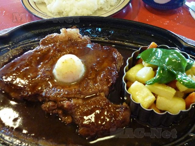 鉄板に乗った肉に、グツグツを沸騰したソースが飛び跳ねて出てきます。