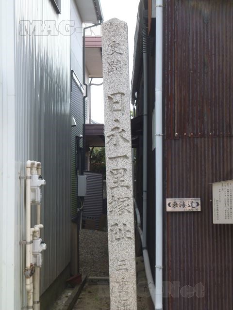 「小古曽神社」を通り2駅先の追分駅を越えると、鳥居の奥に「日永の追分」の石碑があります。