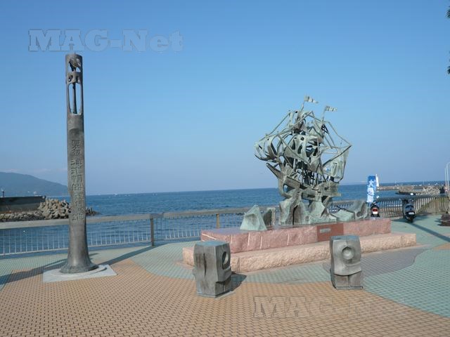 松川に架かる渚橋の手間には、「アダムス胸像」そして帆船のモニュメントが飾られています。