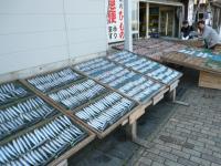 135号線バイパスの山側の歩道にはひものやが店を構え、ずらりと並べられた、いや今まさに干している最中のひものが道いっぱいに並べられています。
