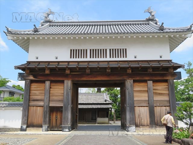 屋根のシャチ瓦が門の威厳を保っており、まるで通行人を睨みつけているかのようです。