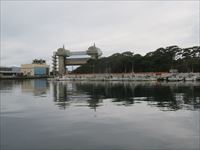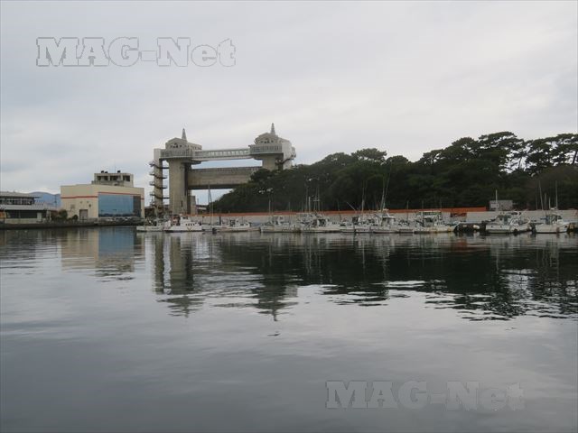 市場の外、海側にはウッドデッキが敷かれており、そこから内港と外港を結ぶ辺りに「びゅうお沼津港展望水門」が見えます。